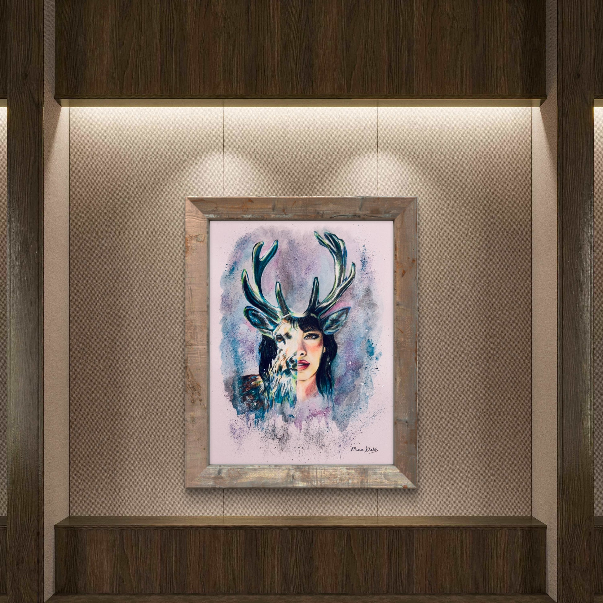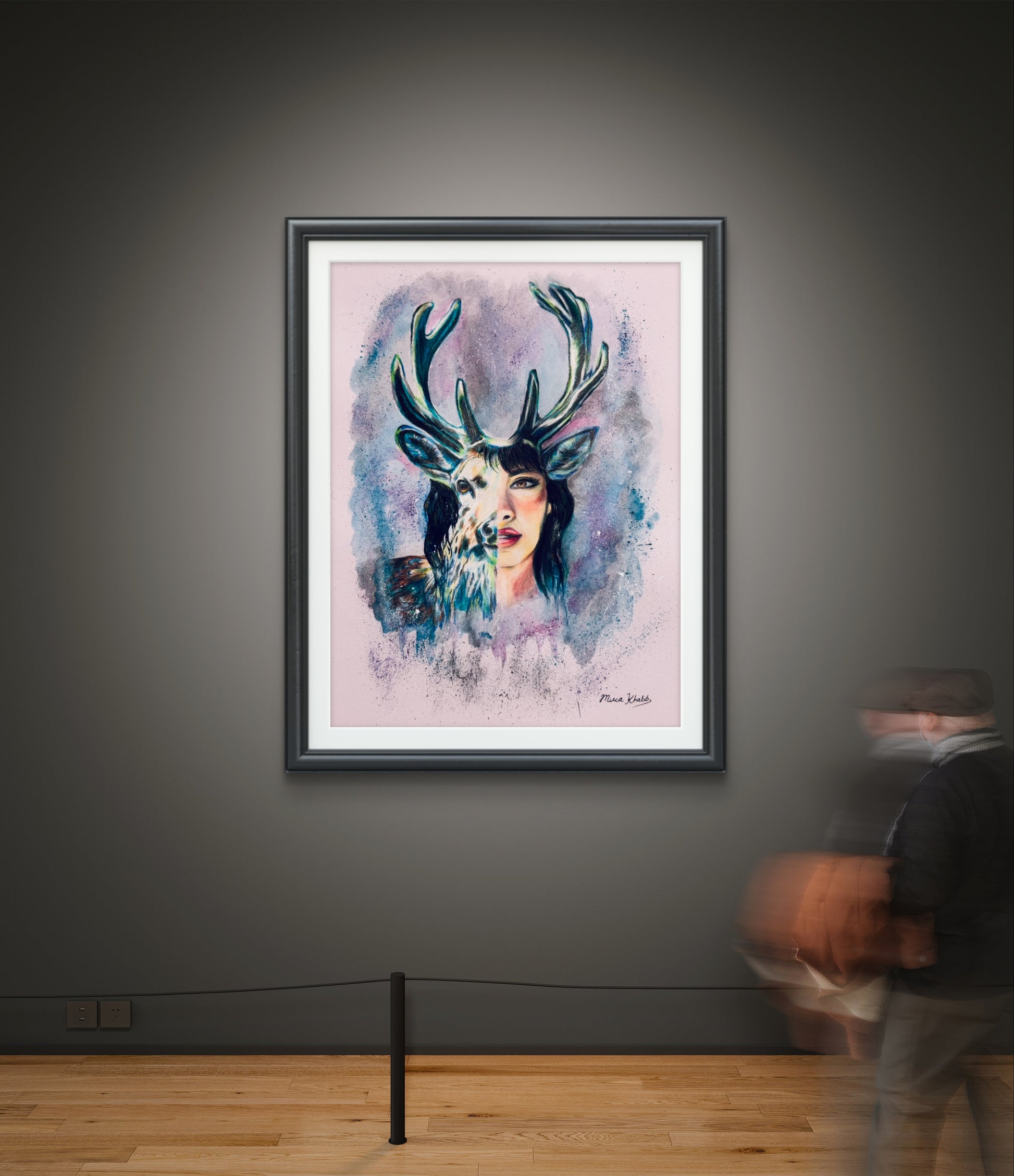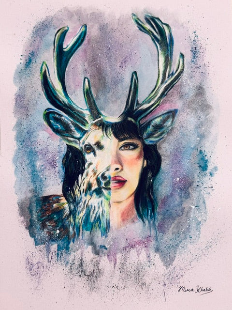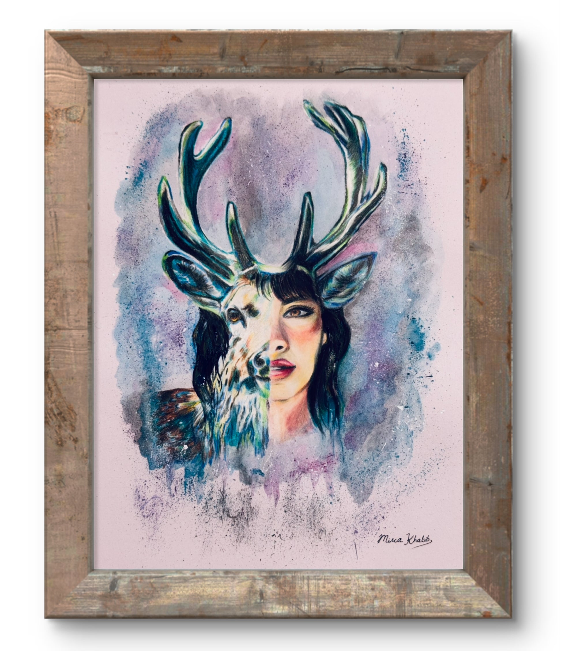 She Deer embodies grace, intuition, and quiet strength — a tribute to the woman who moves through life with elegance yet carries the resilience of a survivor. Part of The Wild series, this original artwork blends the soft features of a deer with the feminine spirit, symbolizing sensitivity, courage, and an unspoken connection to nature.