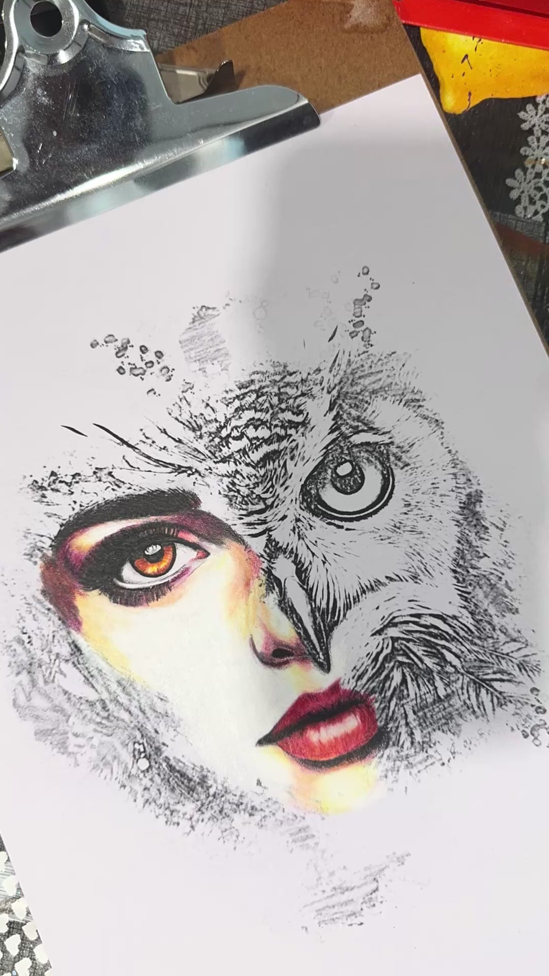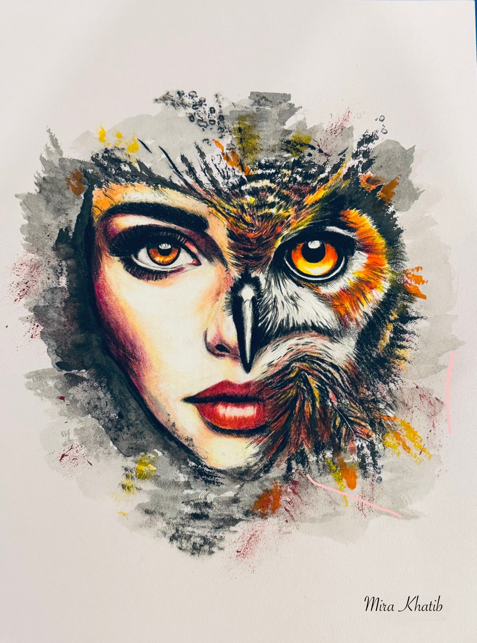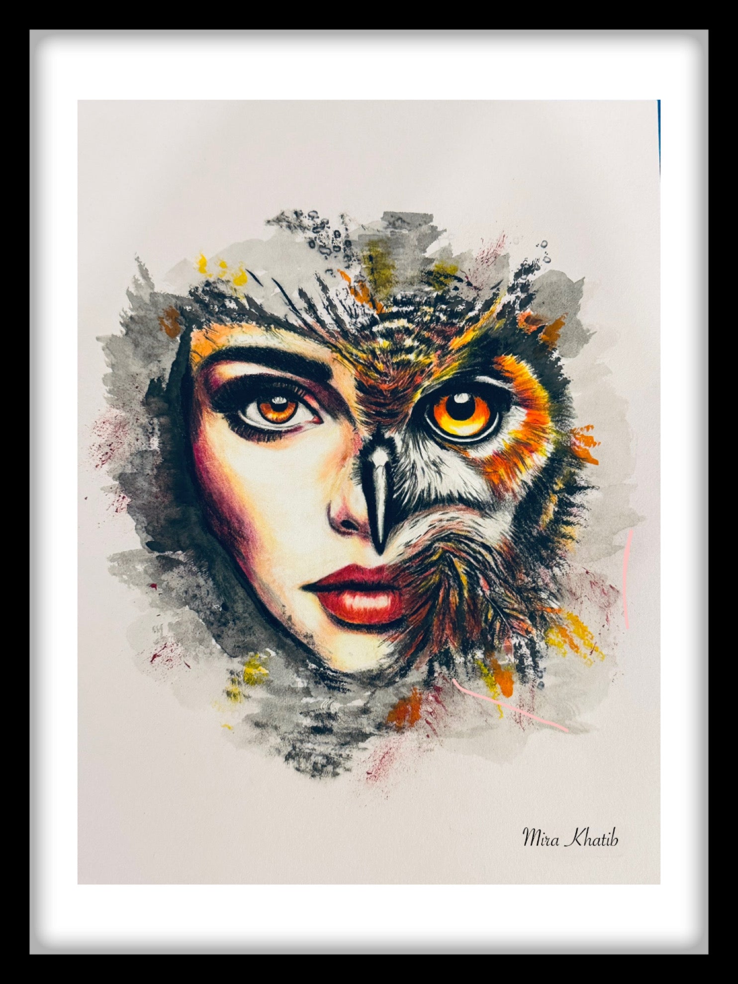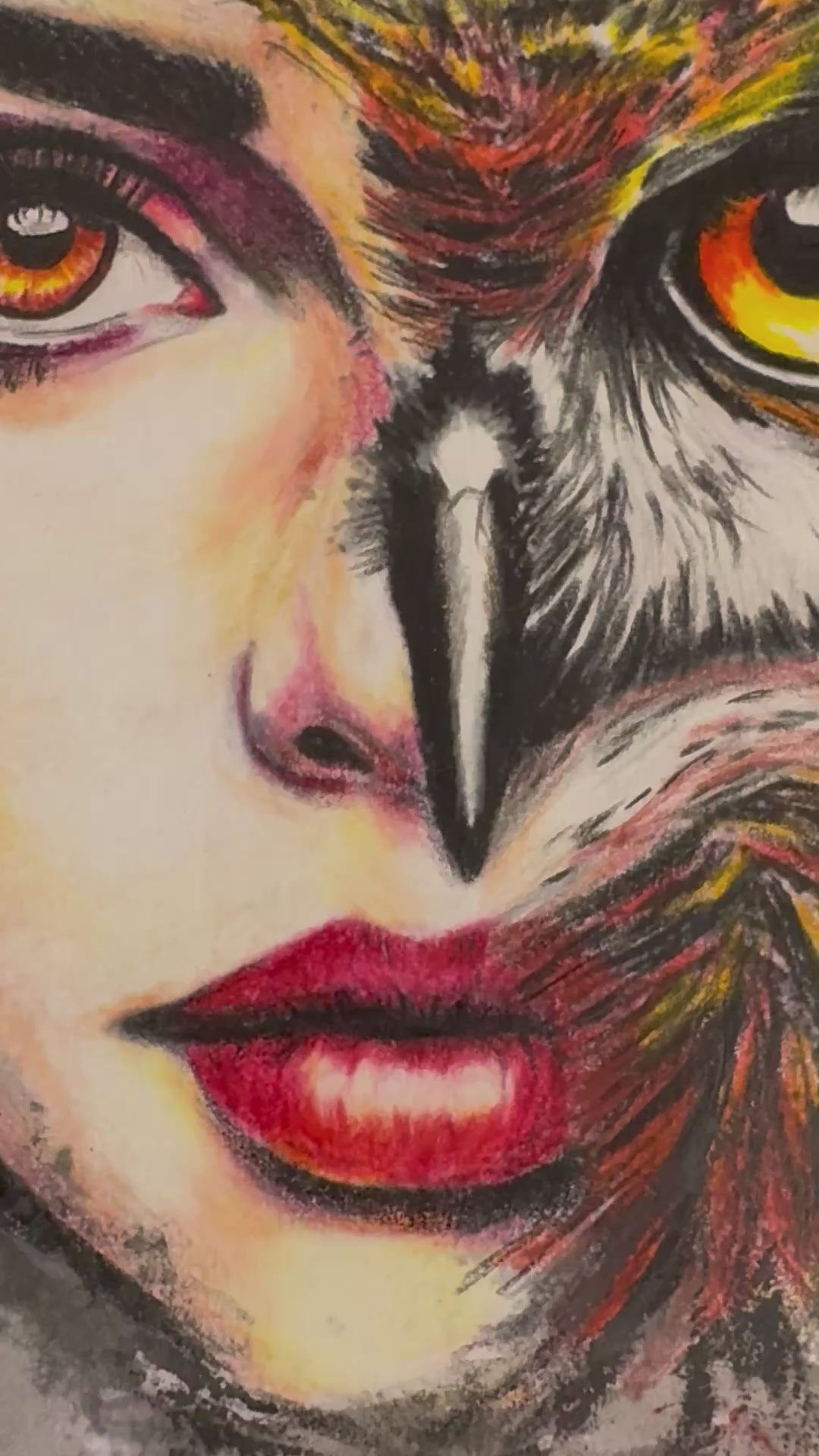 The owl symbolizes observation, patience, and the power of seeing beyond the surface—much like the strength that often goes unnoticed in women. This piece was created with meticulous layers of colored pencil, each stroke a meditation on perseverance and beauty.